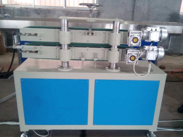該裝置采用軌道式皮帶輸送。鑲入采用了不變向連續輸送的方式,有PLC控制輸送速度,保證了不同線速度時滴頭間距的設定,滴頭連續通過機頭體時得到充分預熱,使滴頭與管壁粘結牢固。